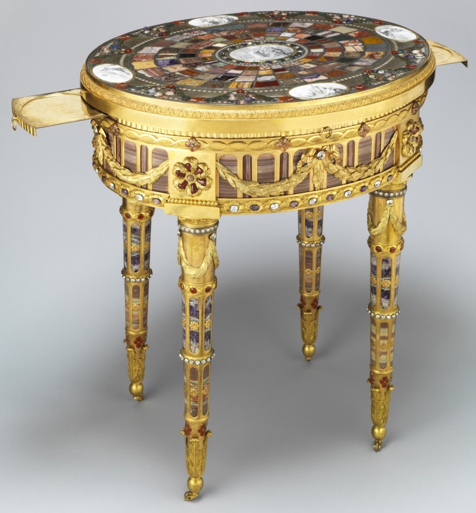Spójrzcie też na misternie wykonany stolik podręczny wykonany w 1779 roku przez jubilera i złotnika Johanna-Christiana Neubera dla króla Saksonii.