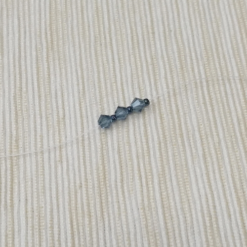 Pomiędzy bicone dodaj po 1 TR 11/0. Na końcu nitka powinna wychodzić z bicone.