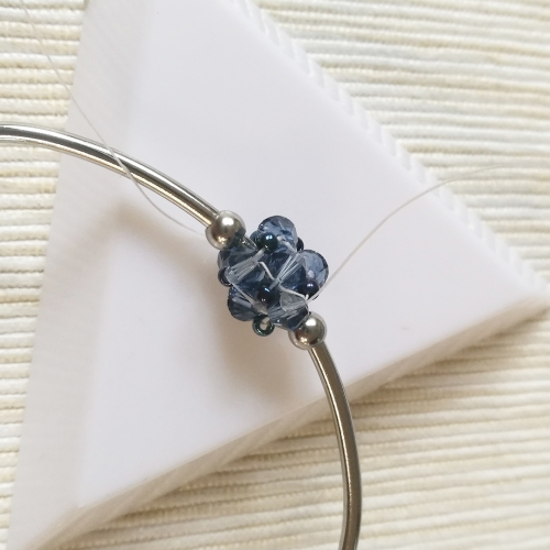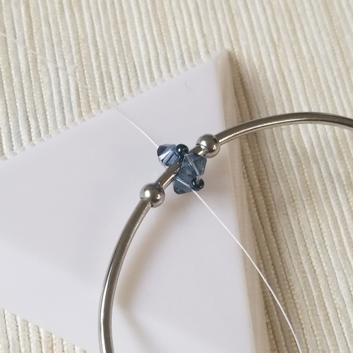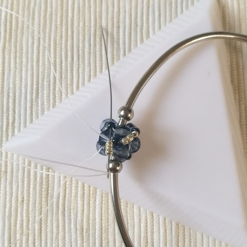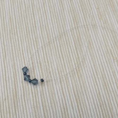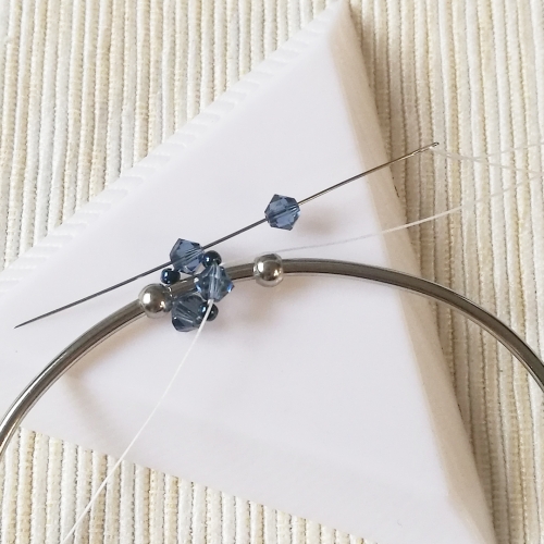 Upewnij się, że nitka wychodzi z bicone. Nabierz 1 koralik bicone i dodaj go między bicone z pierwszego okrążenia. Czynność powtórz jeszcze 2 razy, aż do końca okrążenia.