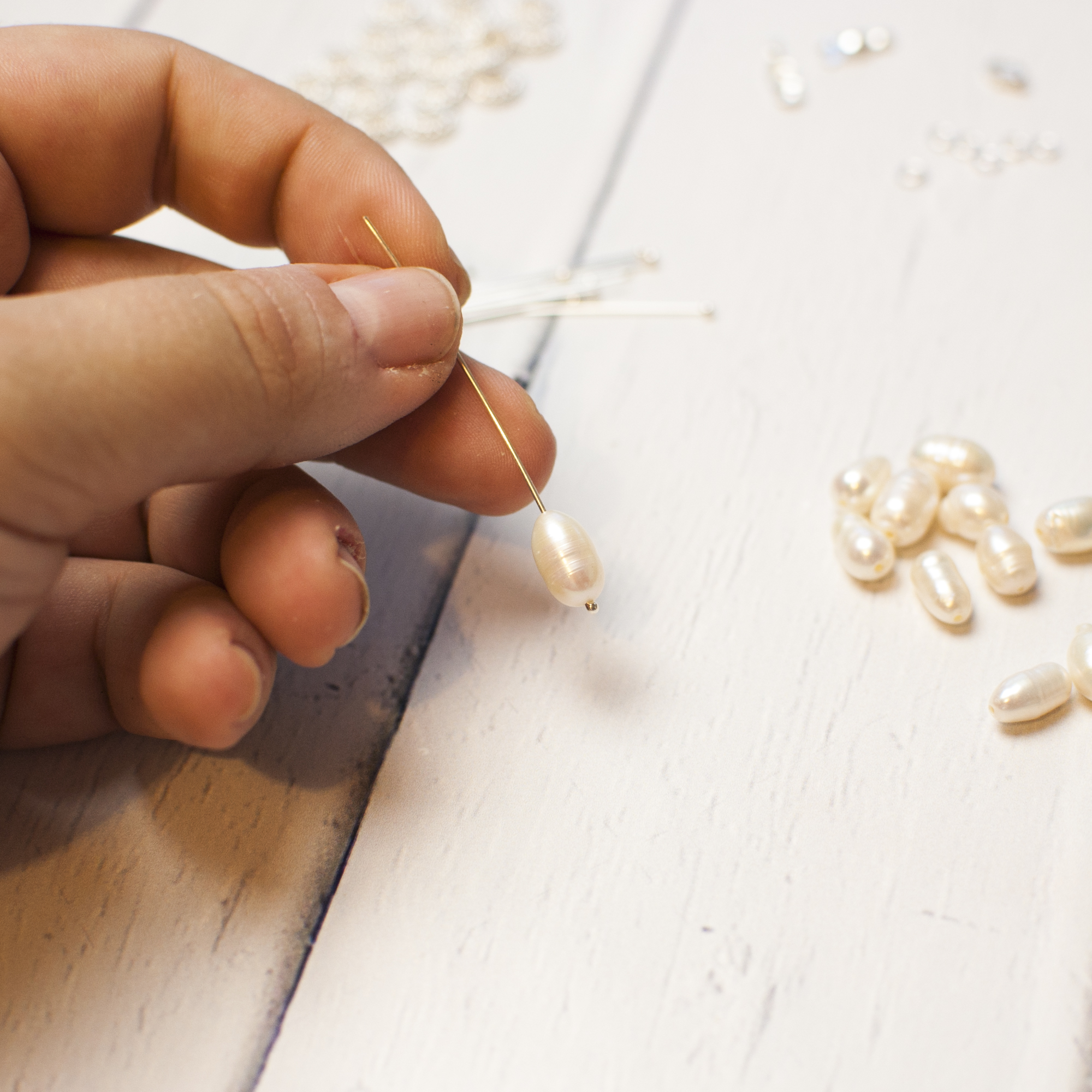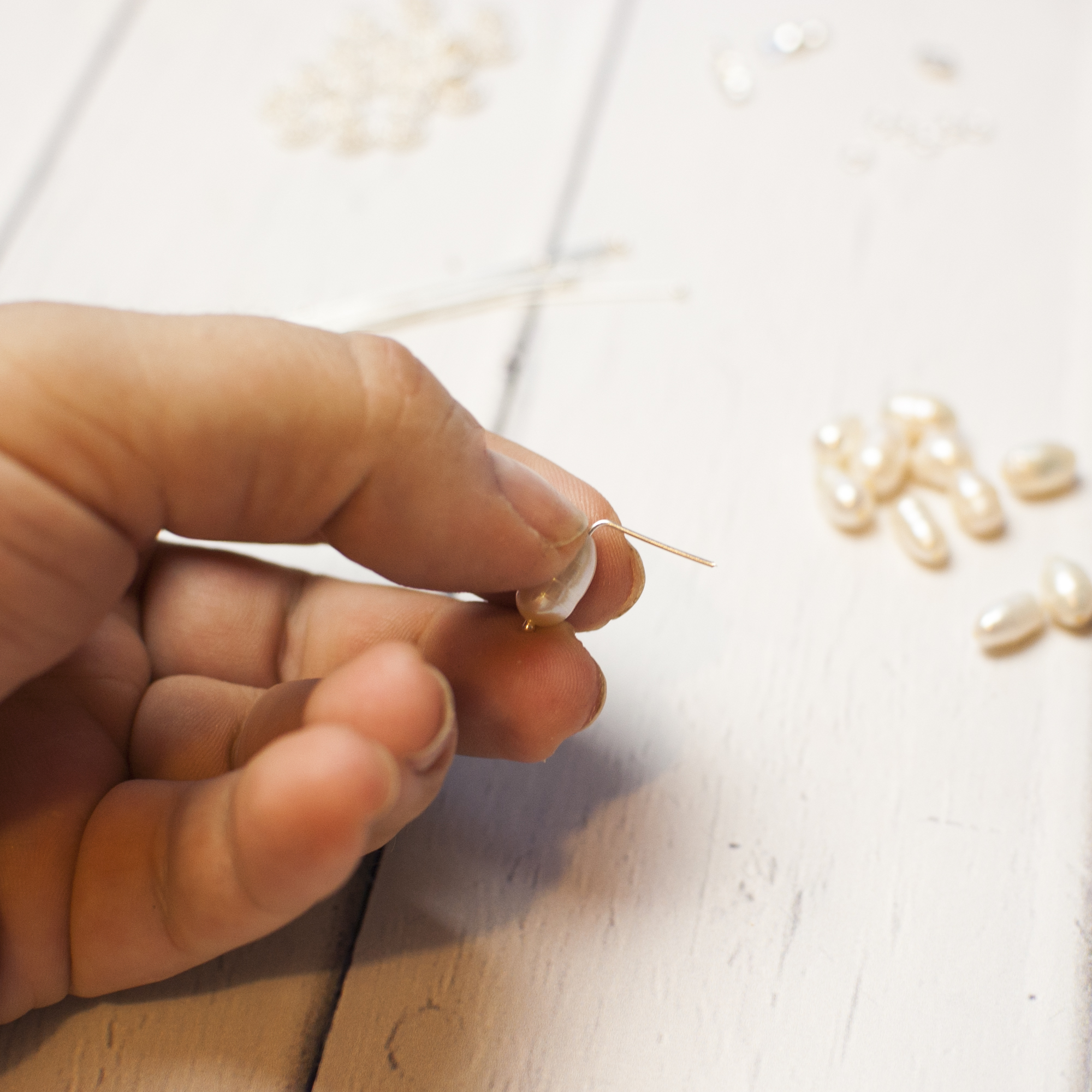 Krok 1. Prace na naszyjnikiem z perłami rice zaczynam nawlekania pereł na srebrne szpilki.