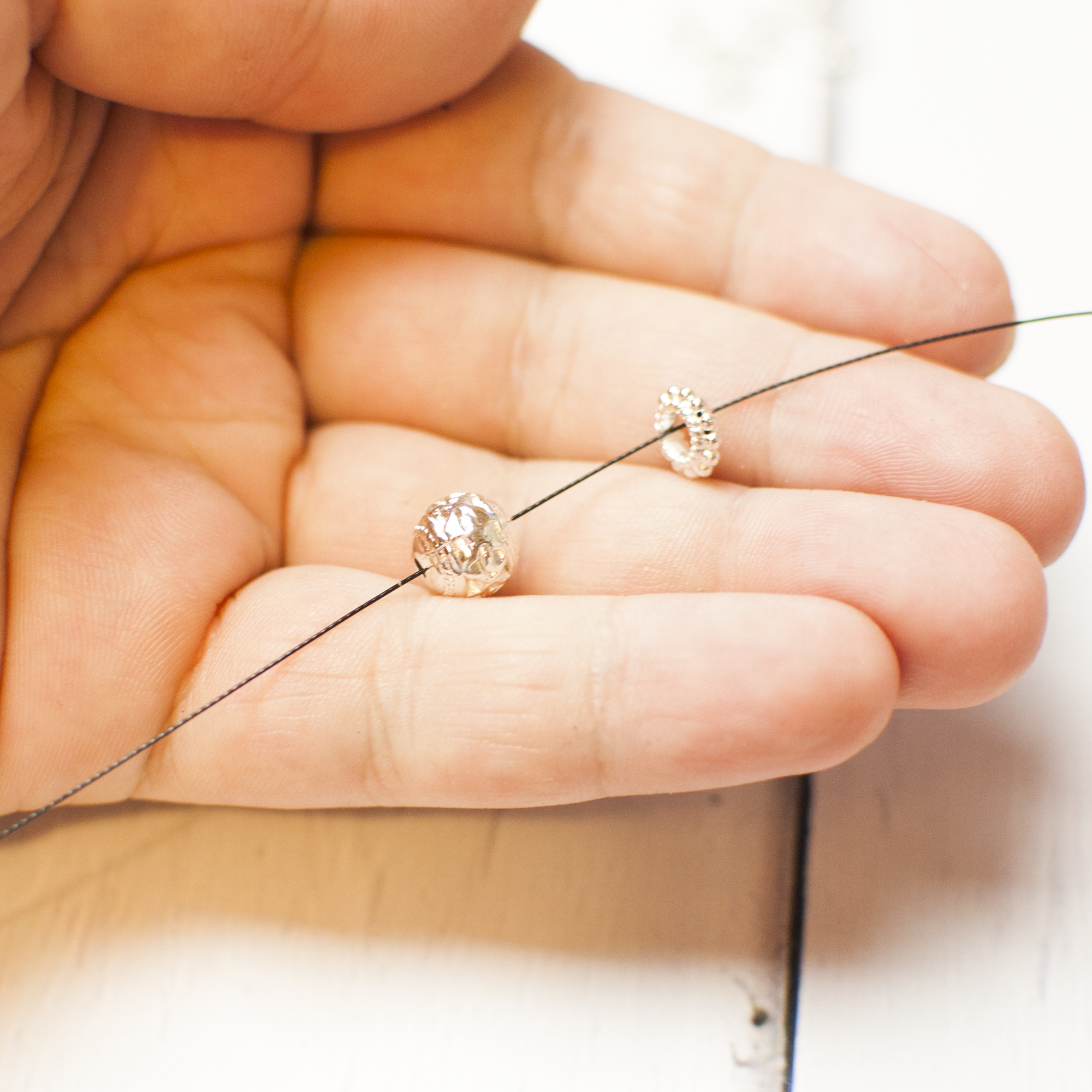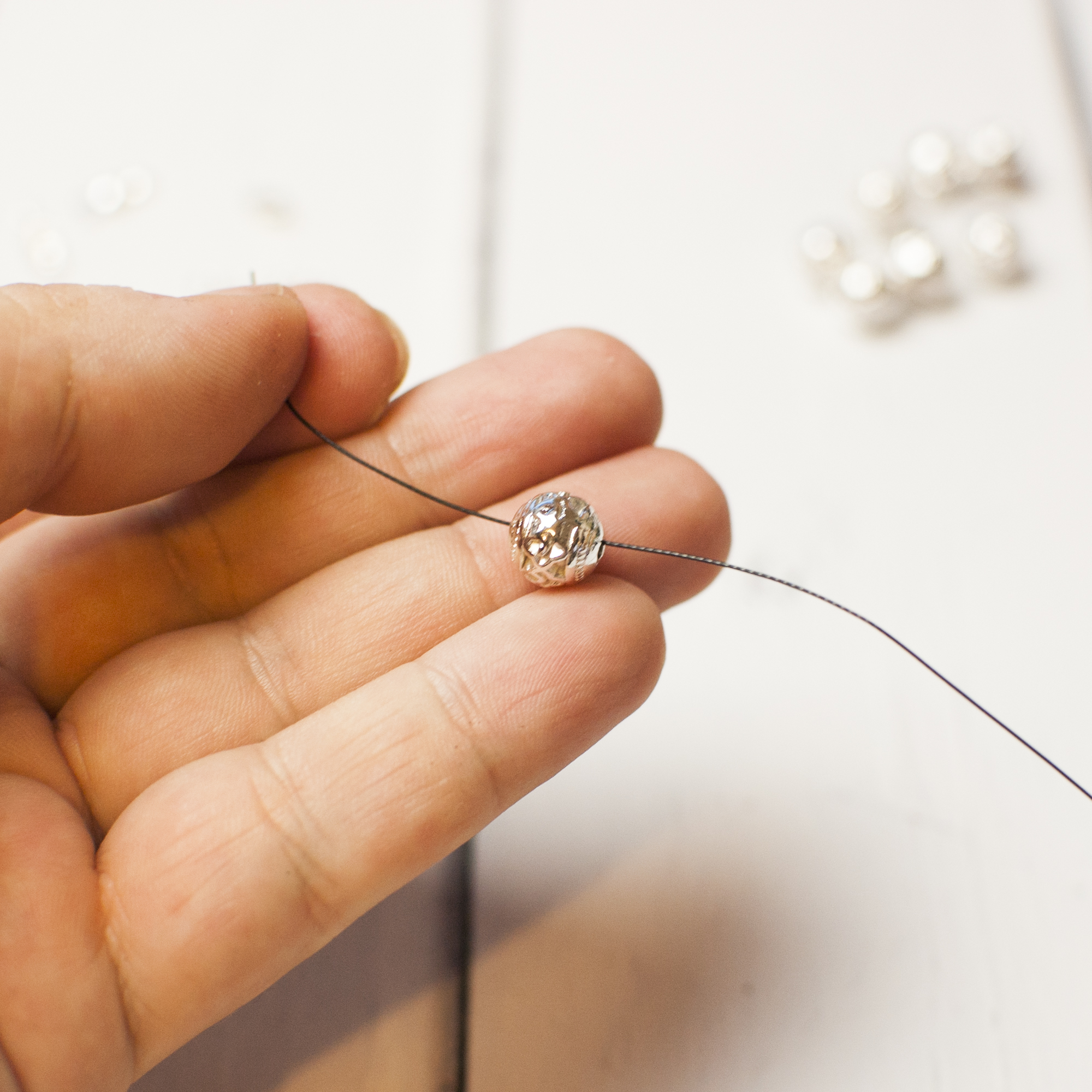 Krok 5. Czas zacząć nawlekać koraliki, przekładki i perły. Zaczynam od koralika z srebrną przekładką.