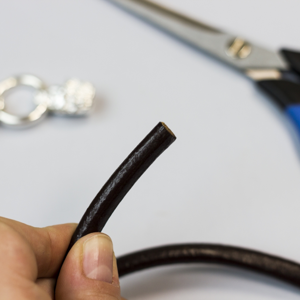 Krok 1. Zaczynam od przygotowania rzemienia. Sprawdzam czy końcówki są równo docięte i długość rzemienia odpowiednia. Zdecydowałam się na podwójną długość, tak aby można było bransoletkę założyć podwójnie na nadgarstku.