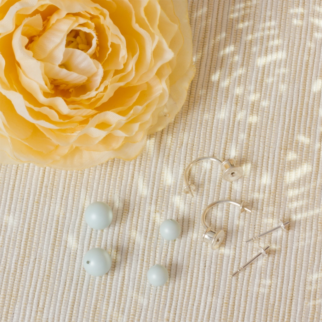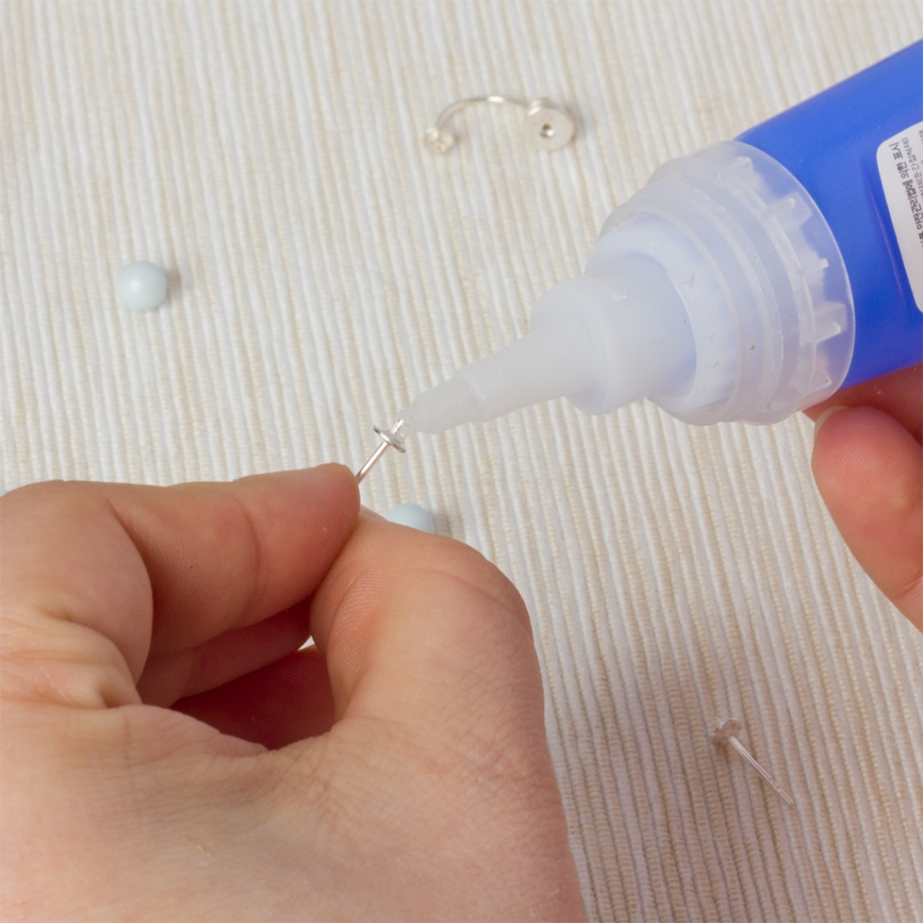 Krok 2. Umieść na sztyfcie perełkę. Zrób to delikatnie – w innym przypadku klej może wycieknąć na perełkę, co sprawi, że powłoka może się zniszczyć. Przytrzymaj chwilkę kolczyk (wystarczy około minuta), niech kuleczka dobrze się ułoży na sztyfcie. Odłóż kolczyk do wyschnięcia. Wystarczy godzina – dwie.