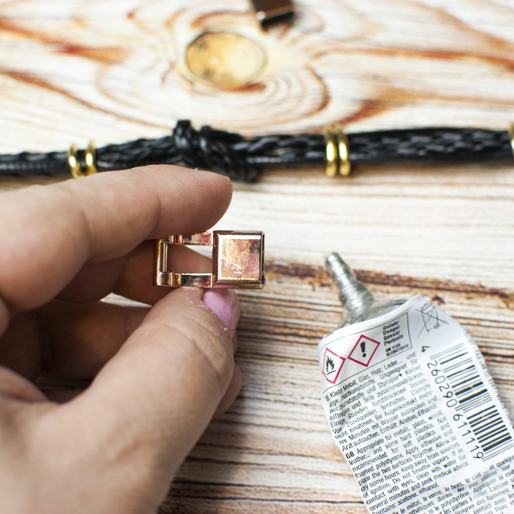 Krok 8. Na koniec wklej końcówki rzemienia i sznurka w elementy zapięcia i pozwól im wyschnąć.