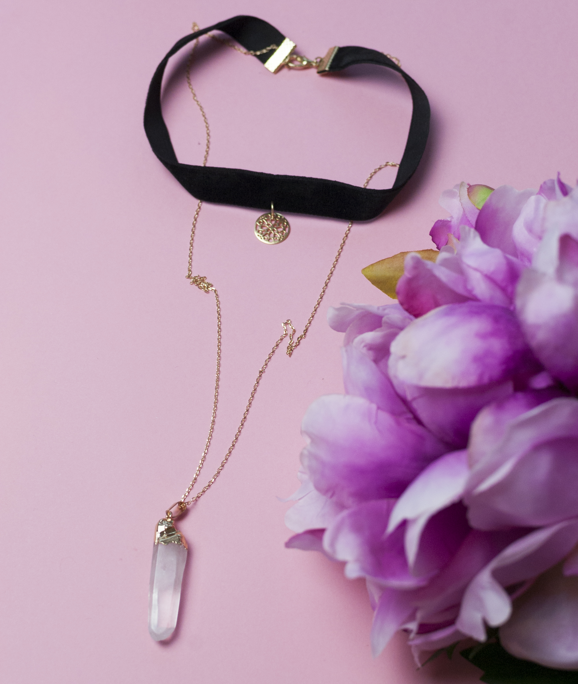 - naszyjnik z trzech warstw, np. jedna to choker ze wstążki z perłą, druga – łańcuszek z geometryczną zawieszką, a trzecia – koralikowy naszyjnik,